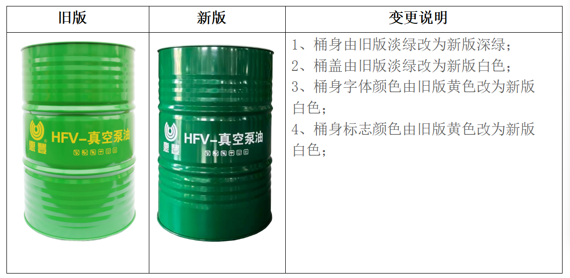感谢您长期以来对苏州惠丰润滑材料有限公司的支持与信赖。为进一步传递品牌理念、优化服务体验,我司现计划对HFV-100#、HFV-100a及HFV-150#真空泵油的200L产品包装进行升级。此次调整旨在以更清晰、专业的形象,持续为您提供优质服务。